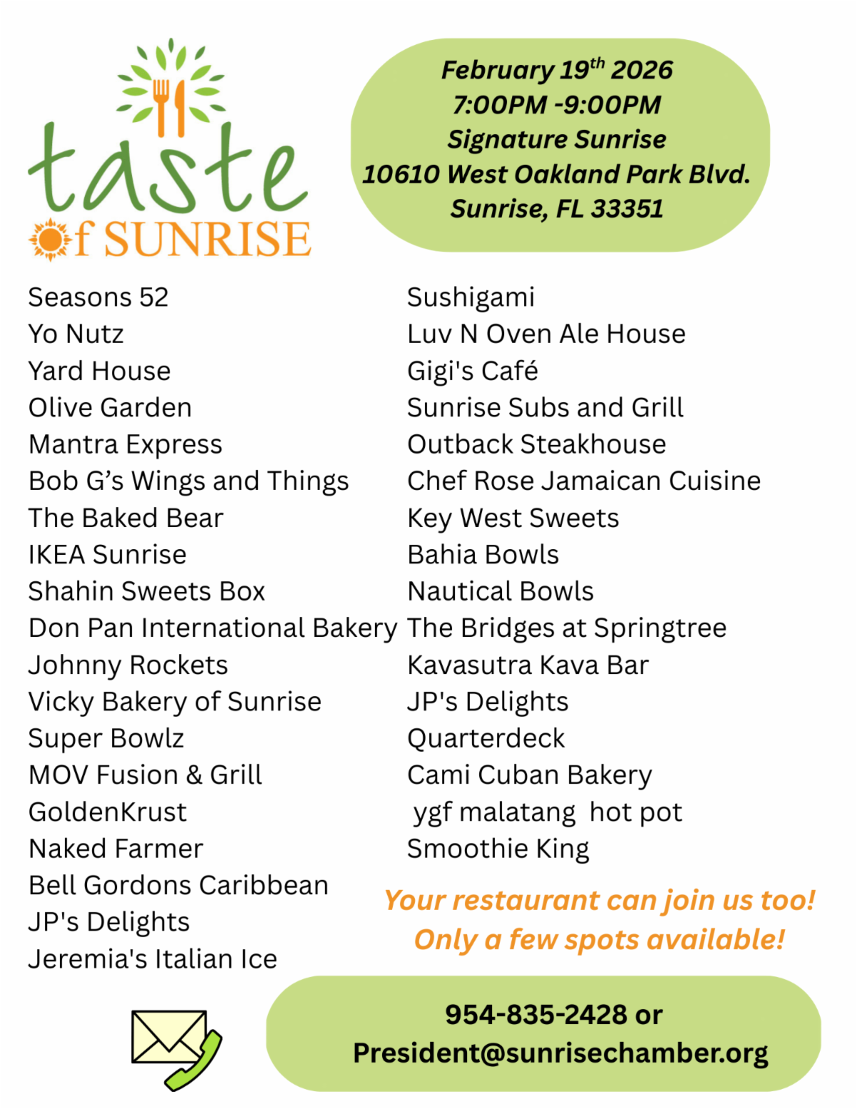 The Greater Sunrise Chamber of Commerce has arranged for more than 35 local restaurants to participate in the annual Taste of Sunrise. Please contact the Chamber office for tickets as this event is always sold out. To participate in 2026 contact the Chamber.